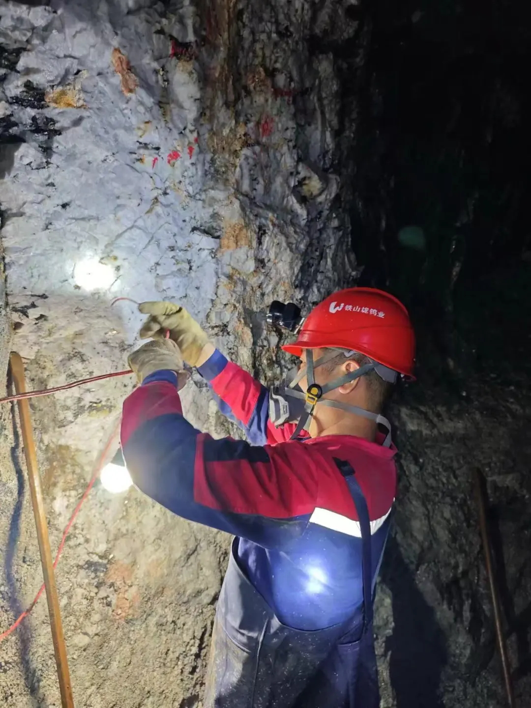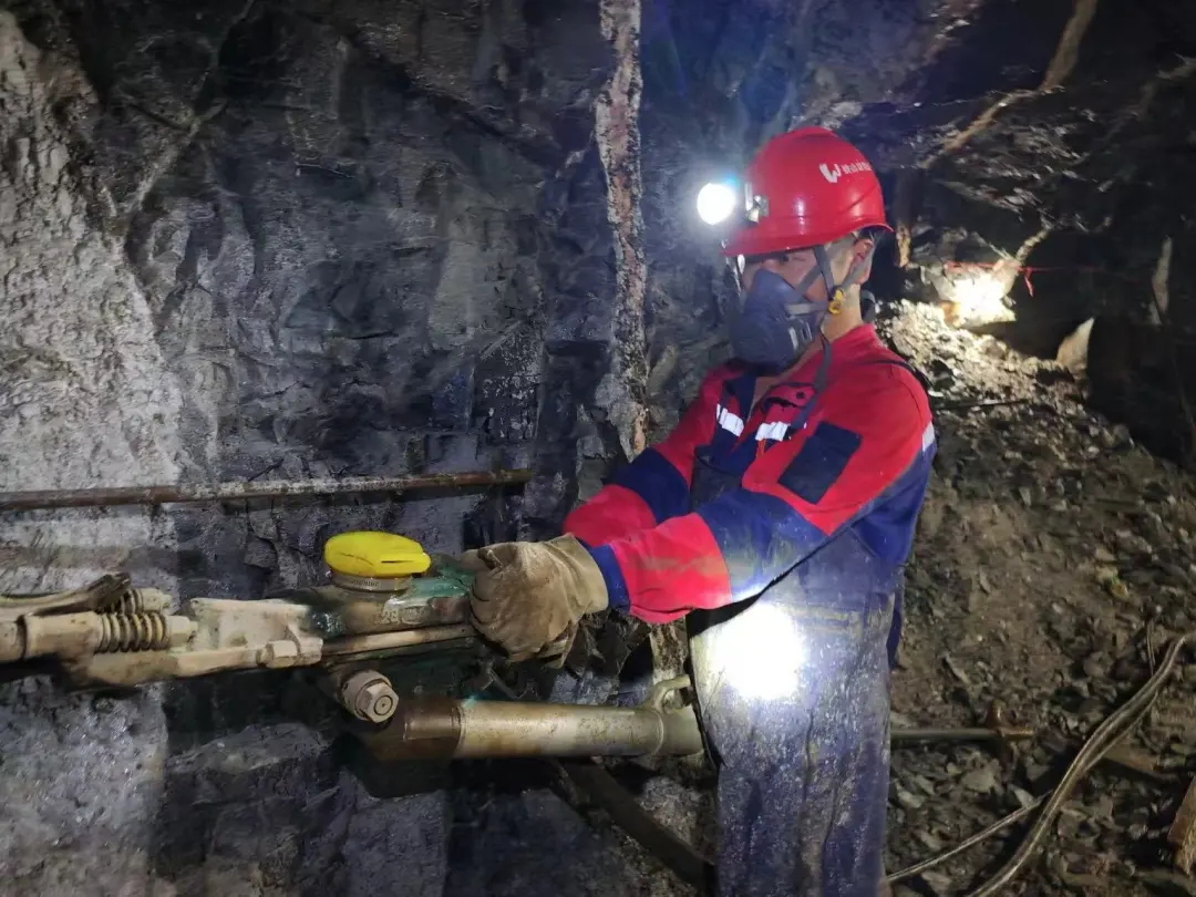 現(xiàn)場(chǎng)安全確認(rèn)后,華攸勝熟練地操作起風(fēng)鉆,反復(fù)調(diào)試。安全帽上礦燈打出的光柱,隨著他的動(dòng)作,在巖壁上不斷移動(dòng)著。在白色礦脈找到鉆點(diǎn)后,他穩(wěn)穩(wěn)地舉起風(fēng)鉆,隨著“嗒嗒”聲響起,鉆桿旋轉(zhuǎn)搖晃,塵霧逐漸彌漫……