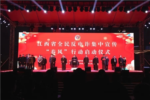 2月9日晚20時(shí),省委宣傳部、省公安廳在南昌市秋水廣場舉行江西省全民反電詐集中宣傳“春風(fēng)”行動(dòng)啟動(dòng)儀式。副省長、公安廳長秦義出席儀式并下達(dá)啟動(dòng)命令,儀式由省政府副秘書長吳龍強(qiáng)主持,公安部督導(dǎo)組成員、省委宣傳部副部長吳永明,南昌市委副書記、市政府黨組書記萬廣明出席儀式。省公安廳黨委委員、南昌市副市長、市公安局長萬秀奇,省公安廳黨委委員、副廳長、廳際聯(lián)席會(huì)議召集人胡滿松出席儀式并講話。江西省打擊治理電信網(wǎng)絡(luò)新型違法犯罪成員單位的負(fù)責(zé)同志、省公安廳在昌廳領(lǐng)導(dǎo)、廳直各單位主要負(fù)責(zé)人,南昌市委宣傳部、市委政法委、市檢、法主要負(fù)責(zé)人,中央和省市各大新聞媒體記者、南昌市干部群眾代表共400余人參加儀式。全省市縣兩級黨委宣傳部門、公安機(jī)關(guān)設(shè)立110個(gè)分會(huì)場,同步舉行“春風(fēng)”行動(dòng)啟動(dòng)儀式。