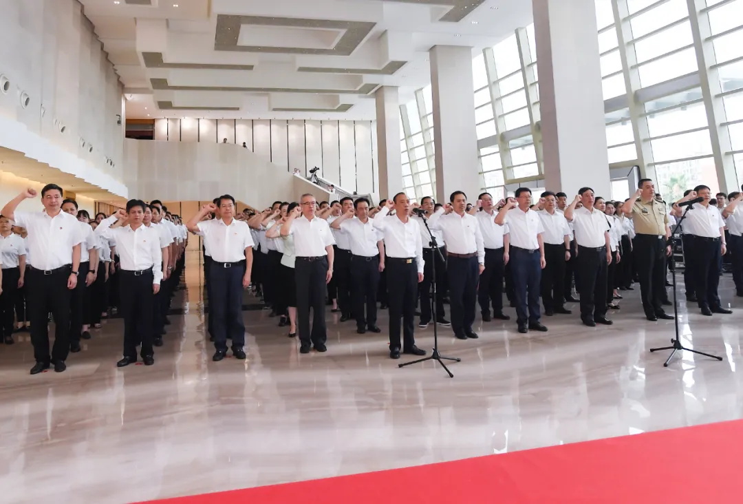 市委書記于秀明領(lǐng)誓并講話。市委副書記、市長(zhǎng)嚴(yán)允主持。張鑒武、陳榮等市四套班子黨員領(lǐng)導(dǎo)出席活動(dòng)。