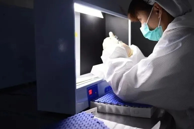在安徽智飛龍科馬生物制藥有限公司新冠疫苗生產(chǎn)線上,工作人員對疫苗進行人工檢測。黃博涵攝(新華社)